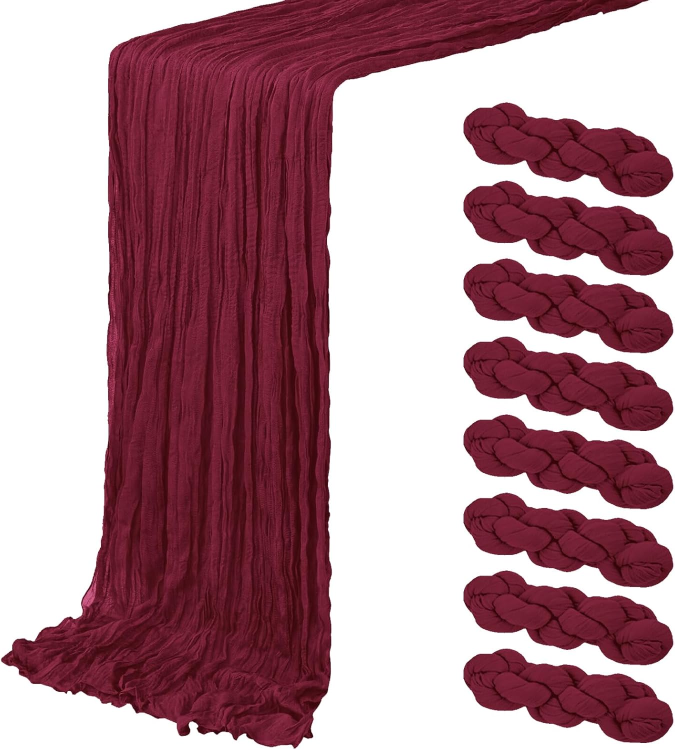 Rustic Cheesecloth Table Runners Product InformationPackage includes: 8 packs 10ft long cheesecloth table runnersColor: Baby Blue Material: High Quality PolyesterDimensions: 20x120 inchesBeige Table Runner Features:1. Our Boho Gauze Cheese Cloth Table Runner made of 100% High quality gauze, The gauze table runner has Beautiful folds, the cloth is exquisite, the seam is firm, and the feel is soft. 2.Let the delicate and airy table runner drape gracefully across your table and flow onto the floor, which adds a romantic atmosphere to your wedding or special events, flowy and dreamy.3.If it is dirty after use, you can hand wash it with a mild detergent in cold water. Please use a laundry bag if machine washing, lay flat or hang to dry.Widely Use:perfect for weddings, parties, baby showers, woodland baby showers,hunting baby showers, arch curtains, Easter, Christmas, birthdays or any other event you want to celebrate, adding a romantic touch and creating a warm party atmosphere.Excellent service:If you have any questions, please feel free to contact us,we will solve your questions 24 hours a day and ensure your satisfaction