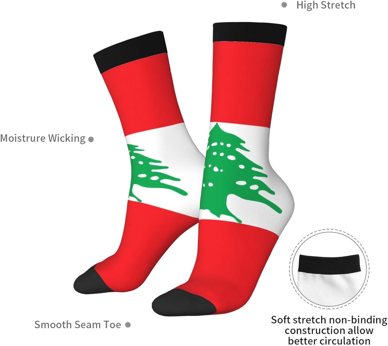Flag of Lebanon These socks are made from a blend of 95% polyester and 5% spandex, offering a skin-friendly and comfortable feel with excellent moisture-wicking, breathability, and pilling resistance to keep feet dry at all times. The spandex provides ample elasticity, ensuring zero pressure on the feet, while the stylish black toe adds a touch of trendy sock quality. The socks feature an all-over print design; avoid extremely fine fonts or patterns to ensure optimal print quality. Combining warmth and style, these socks are suitable for both everyday wear and sports, and come in sizes that cover most foot lengths (36-45cm). They are a versatile accessory that combines comfort, fashion, and practicality.