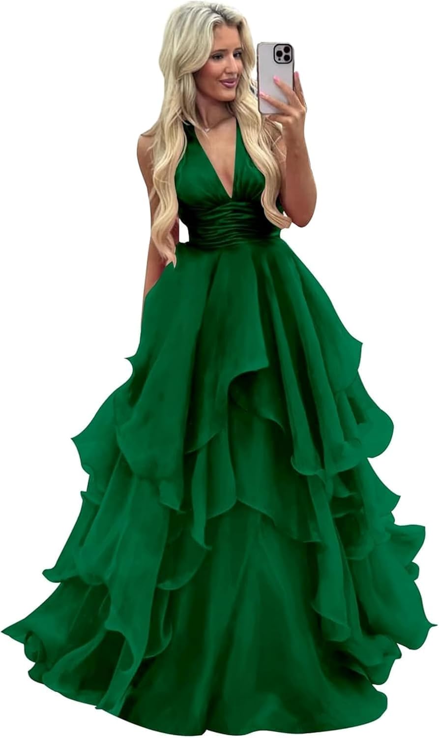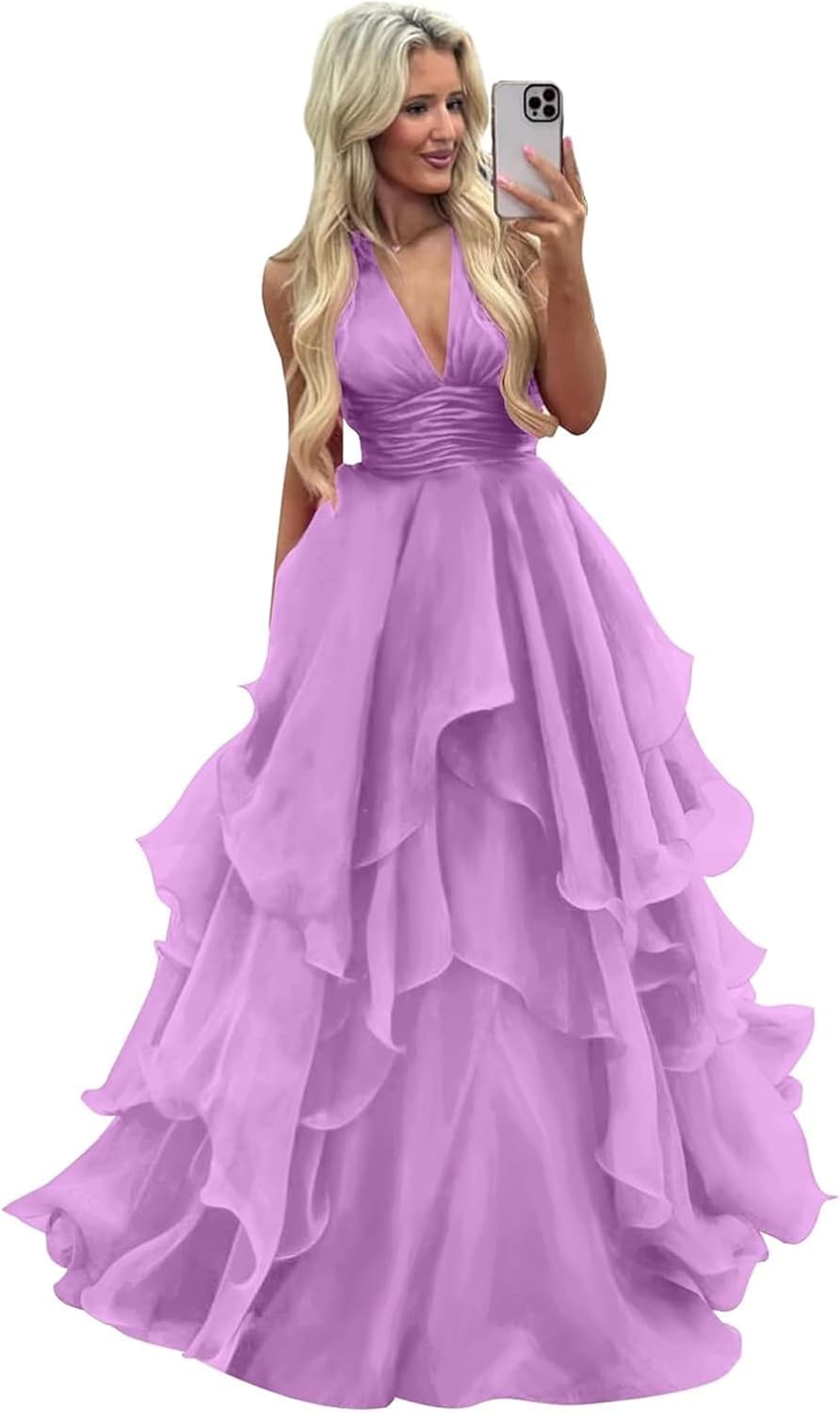 Make a stunning entrance at your next formal event in this breathtaking ball gown. This dress features an elegant V-neck design that gracefully frames the neckline. The fitted bodice creates a flattering silhouette before flowing into a dramatic, full skirt adorned with cascading ruffles that create mesmerizing movement with every step. Showcases a romantic corset-style back with delicate lace-up details.The floor-length design is perfect for proms, galas, or any black-tie occasion where you want to command attention. The thoughtfully structured bodice provides support while maintaining comfort throughout your special evening.