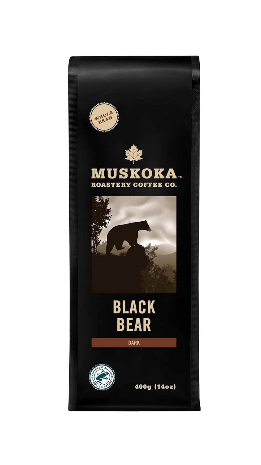 The coffee that put us on the map; a perfect blend of South and Central American beans roasted to a well-oiled, smokey finish. Bold, full-bodied taste with a growl. At 2 metres in length and up to 150 kilograms in weight, the black bear is a powerful animal. The good news is that they are, by nature, reclusive and try to avoid contact with humans. Countering that is the fact that male bears may cover a territory as broad as 140 square kilometres in search of food (and female bears), and that Algonquin Park has estimated that there is one bear for every 3-4 square kilometres. So, encountering a black bear in Muskoka is not an uncommon event. In our painstaking research on black bears we learned that they are omnivores, which means they will eat anything. The detailed list includes plants, berries, seeds, and insects while, encouragingly, excluding humans.